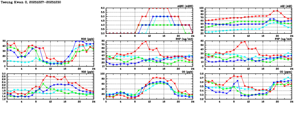| Air Quality Data Time Series in Tseung Kwan O (2025/12/30) | ( Line colors: Day -3 Day -2 Day -1 Current day ) | 2D Map Current AQHI |