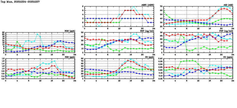 | Air Quality Data Time Series in Tap Mun (2025/12/27) | ( Line colors: Day -3 Day -2 Day -1 Current day ) | 2D Map Current AQHI |