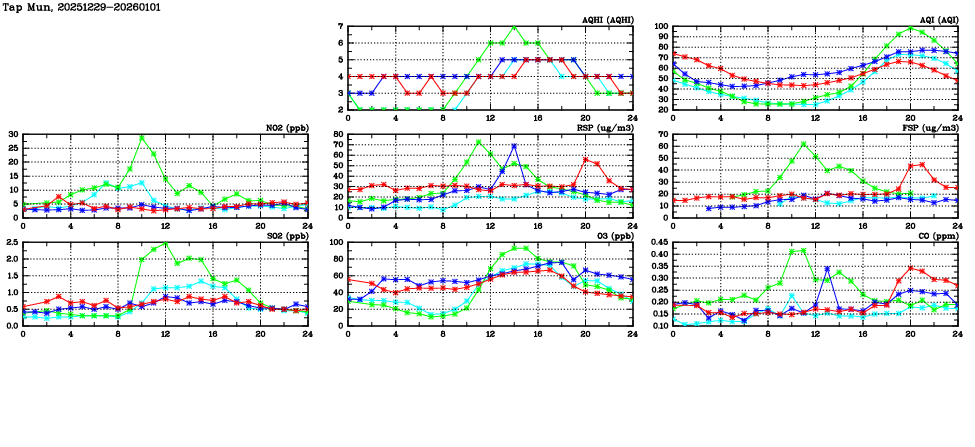 | Air Quality Data Time Series in Tap Mun (2026/01/01) | ( Line colors: Day -3 Day -2 Day -1 Current day ) | 2D Map Current AQHI |