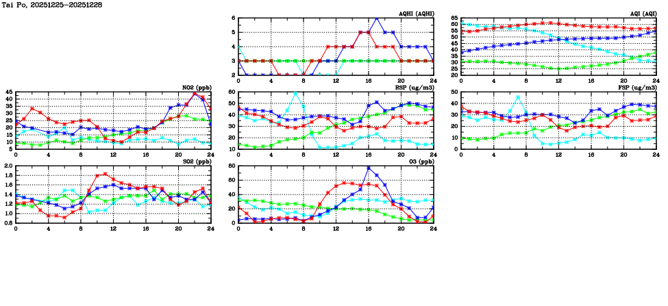 | Air Quality Data Time Series in Tai Po (2025/12/28) | ( Line colors: Day -3 Day -2 Day -1 Current day ) | 2D Map Current AQHI |