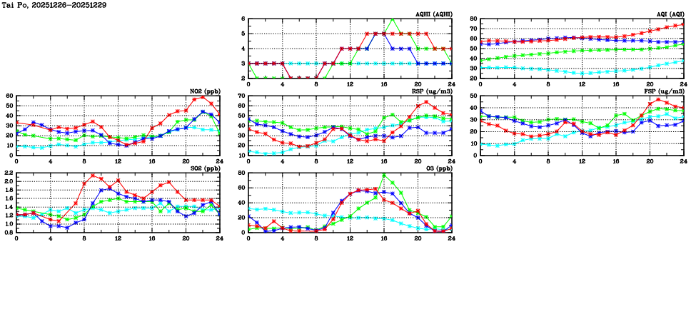 | Air Quality Data Time Series in Tai Po (2025/12/29) | ( Line colors: Day -3 Day -2 Day -1 Current day ) | 2D Map Current AQHI |