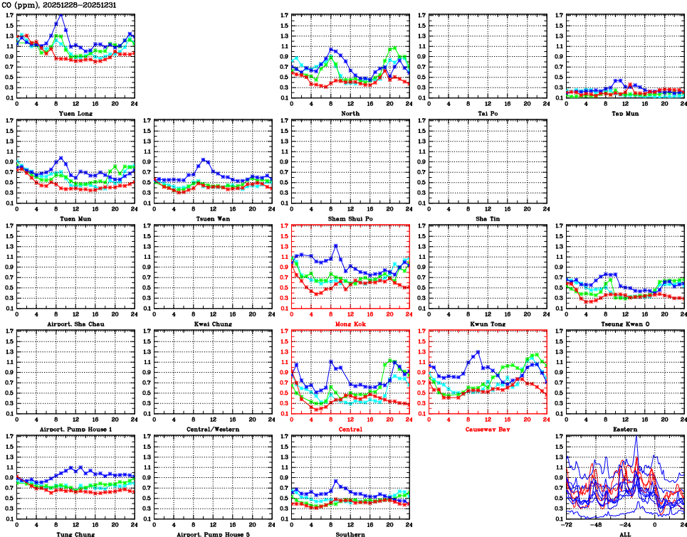 | Air Quality Data Time Series for CO (2025/12/31) | ( Line colors: Day -3 Day -2 Day -1 Current day ) | 2D Map Current AQHI |