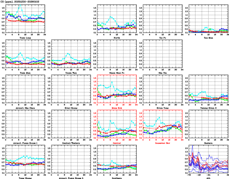 | Air Quality Data Time Series for CO (2026/01/02) | ( Line colors: Day -3 Day -2 Day -1 Current day ) | 2D Map Current AQHI |