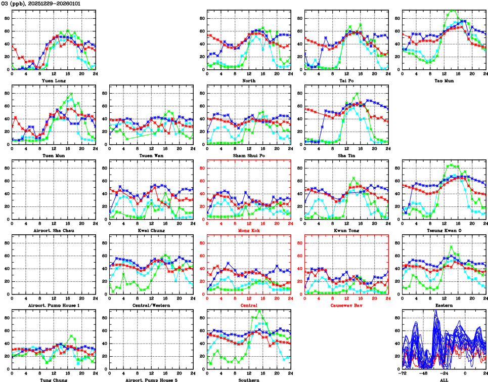 | Air Quality Data Time Series for O3 (2026/01/01) | ( Line colors: Day -3 Day -2 Day -1 Current day ) | 2D Map Current AQHI |