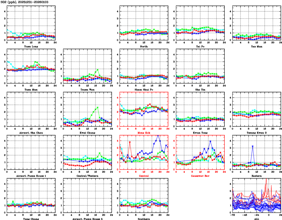 | Air Quality Data Time Series for SO2 (2026/01/03) | ( Line colors: Day -3 Day -2 Day -1 Current day ) | 2D Map Current AQHI |