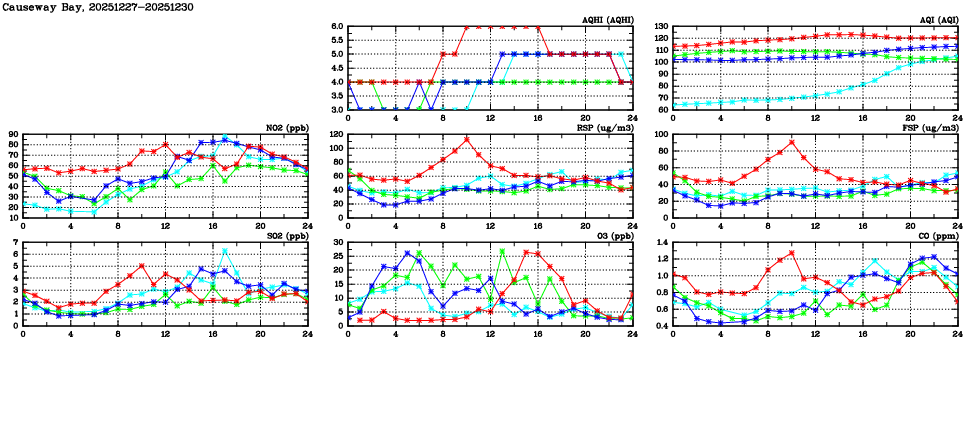 | Air Quality Data Time Series in Causeway Bay (2025/12/30) | ( Line colors: Day -3 Day -2 Day -1 Current day ) | 2D Map Current AQHI |