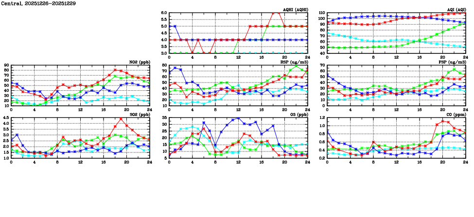 | Air Quality Data Time Series in Central (2025/12/29) | ( Line colors: Day -3 Day -2 Day -1 Current day ) | 2D Map Current AQHI |