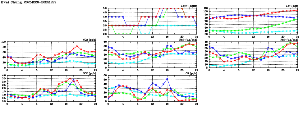 | Air Quality Data Time Series in Kwai Chung (2025/12/29) | ( Line colors: Day -3 Day -2 Day -1 Current day ) | 2D Map Current AQHI |