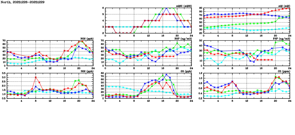 | Air Quality Data Time Series in North (2025/12/29) | ( Line colors: Day -3 Day -2 Day -1 Current day ) | 2D Map Current AQHI |