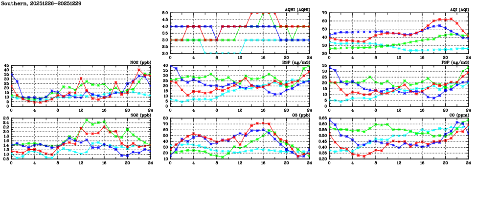 | Air Quality Data Time Series in Southern (2025/12/29) | ( Line colors: Day -3 Day -2 Day -1 Current day ) | 2D Map Current AQHI |