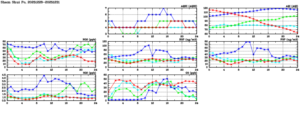 | Air Quality Data Time Series in Sham Shui Po (2025/12/31) | ( Line colors: Day -3 Day -2 Day -1 Current day ) | 2D Map Current AQHI |