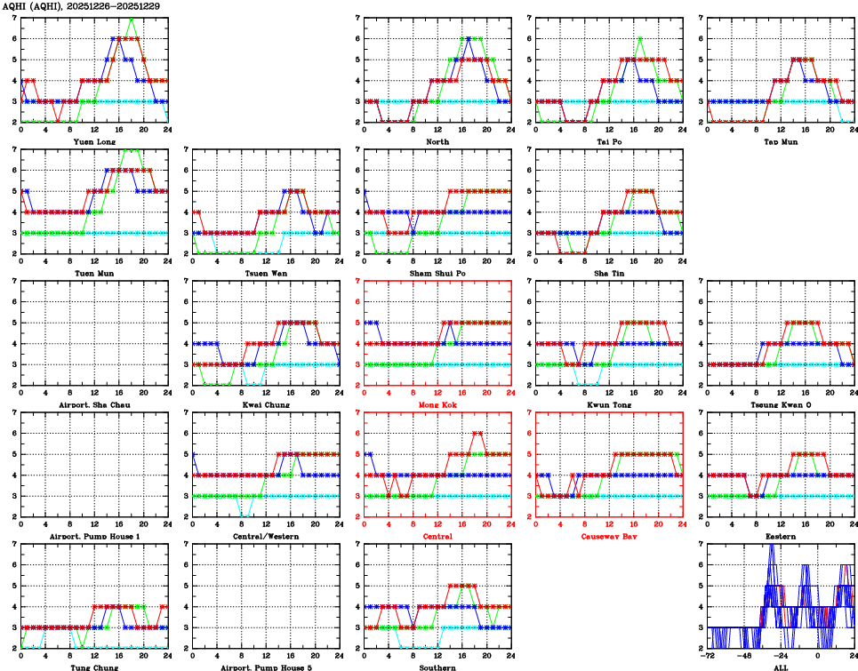 | Air Quality Data Time Series for AQHI (2025/12/29) | ( Line colors: Day -3 Day -2 Day -1 Current day ) | 2D Map Current AQHI |