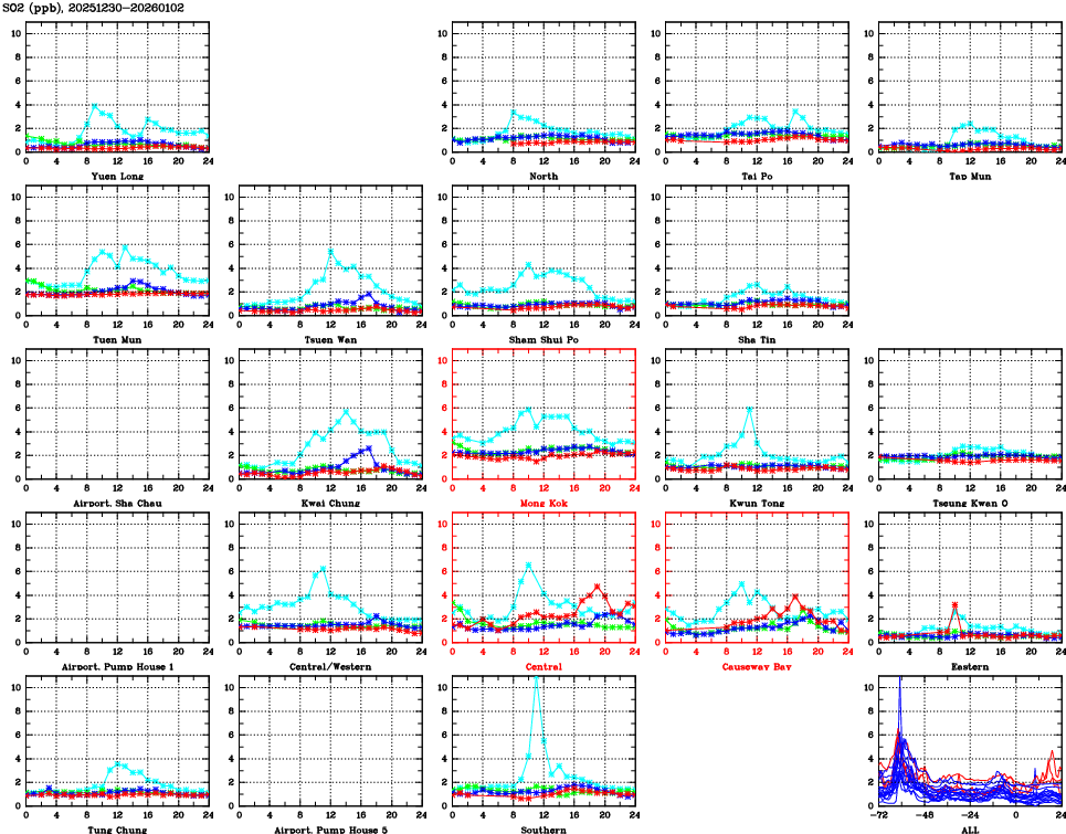 | Air Quality Data Time Series for SO2 (2026/01/02) | ( Line colors: Day -3 Day -2 Day -1 Current day ) | 2D Map Current AQHI |