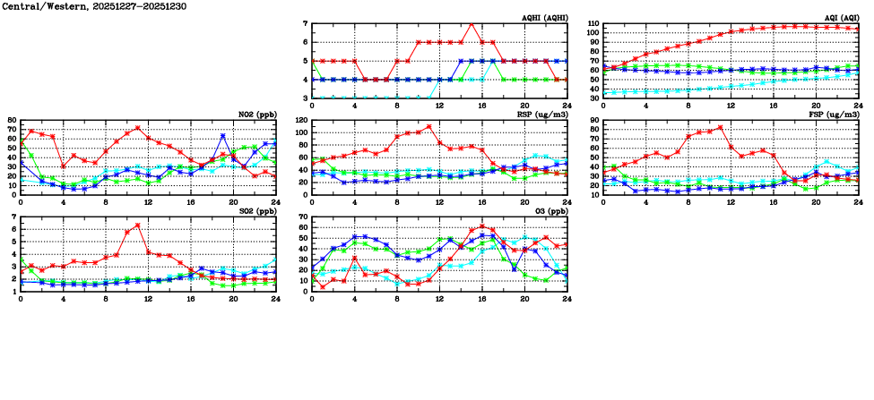 | Air Quality Data Time Series in Central/Western (2025/12/30) | ( Line colors: Day -3 Day -2 Day -1 Current day ) | 2D Map Current AQHI |