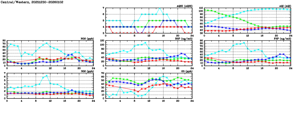 | Air Quality Data Time Series in Central/Western (2026/01/02) | ( Line colors: Day -3 Day -2 Day -1 Current day ) | 2D Map Current AQHI |