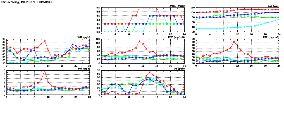 | Air Quality Data Time Series in Kwun Tong (2025/12/30) | ( Line colors: Day -3 Day -2 Day -1 Current day ) | 2D Map Current AQHI |