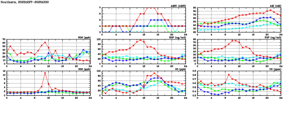 | Air Quality Data Time Series in Southern (2025/12/30) | ( Line colors: Day -3 Day -2 Day -1 Current day ) | 2D Map Current AQHI |