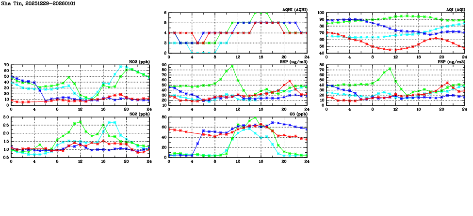 | Air Quality Data Time Series in Sha Tin (2026/01/01) | ( Line colors: Day -3 Day -2 Day -1 Current day ) | 2D Map Current AQHI |