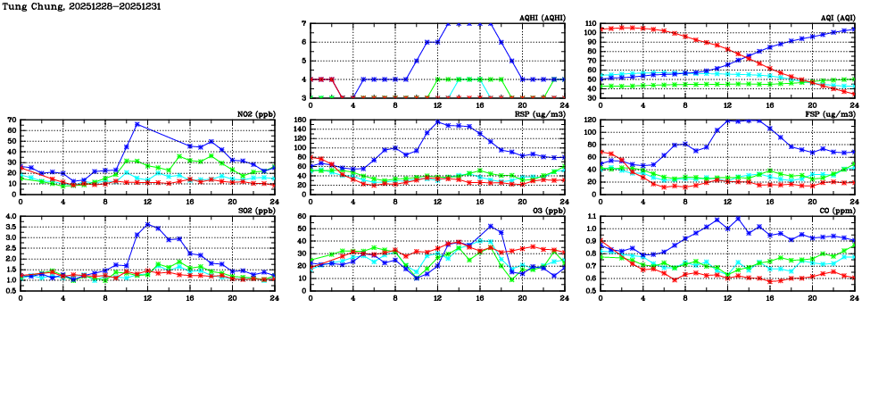 | Air Quality Data Time Series in Tung Chung (2025/12/31) | ( Line colors: Day -3 Day -2 Day -1 Current day ) | 2D Map Current AQHI |