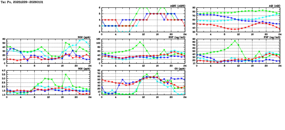 | Air Quality Data Time Series in Tai Po (2026/01/01) | ( Line colors: Day -3 Day -2 Day -1 Current day ) | 2D Map Current AQHI |