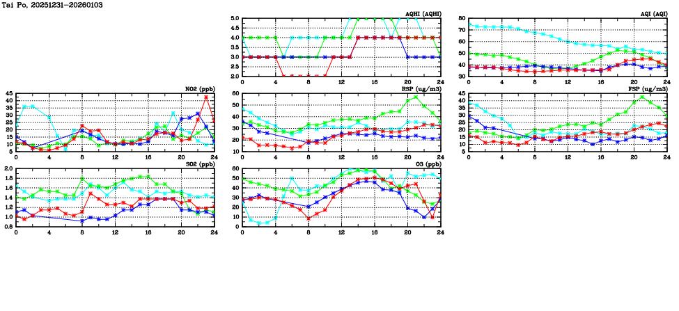 | Air Quality Data Time Series in Tai Po (2026/01/03) | ( Line colors: Day -3 Day -2 Day -1 Current day ) | 2D Map Current AQHI |