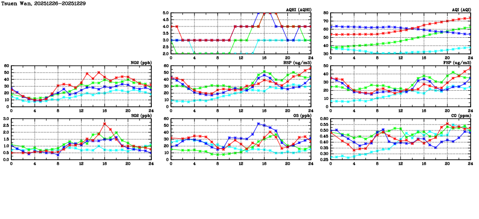 | Air Quality Data Time Series in Tsuen Wan (2025/12/29) | ( Line colors: Day -3 Day -2 Day -1 Current day ) | 2D Map Current AQHI |