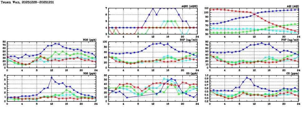| Air Quality Data Time Series in Tsuen Wan (2025/12/31) | ( Line colors: Day -3 Day -2 Day -1 Current day ) | 2D Map Current AQHI |