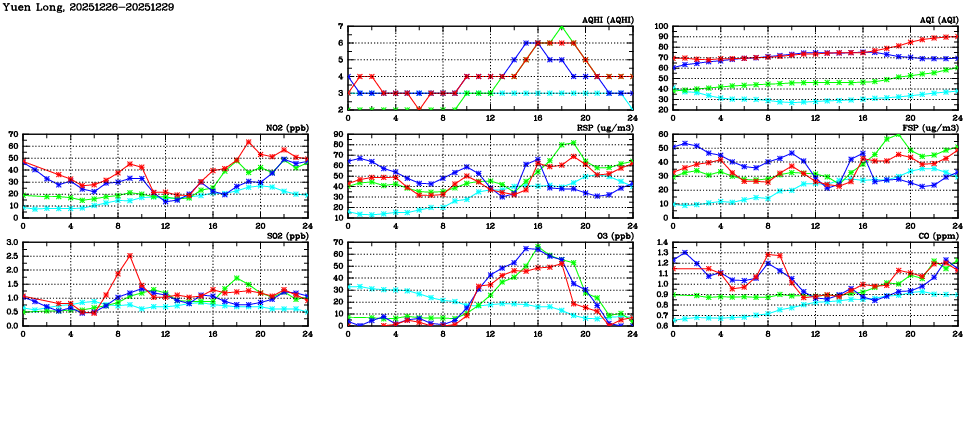 | Air Quality Data Time Series in Yuen Long (2025/12/29) | ( Line colors: Day -3 Day -2 Day -1 Current day ) | 2D Map Current AQHI |