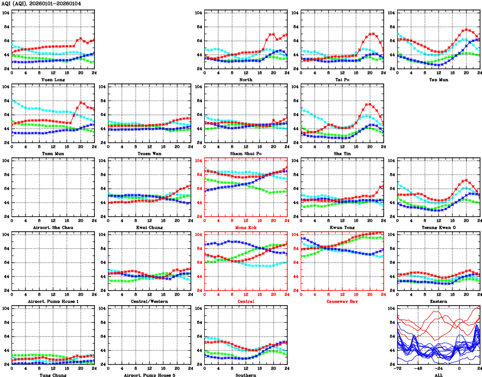 | Air Quality Data Time Series for AQI (2026/01/04) | ( Line colors: Day -3 Day -2 Day -1 Current day ) | 2D Map Current AQHI |