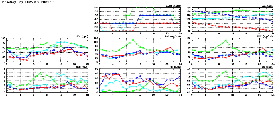 | Air Quality Data Time Series in Causeway Bay (2026/01/01) | ( Line colors: Day -3 Day -2 Day -1 Current day ) | 2D Map Current AQHI |