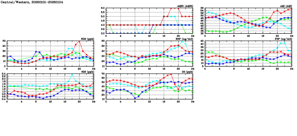 | Air Quality Data Time Series in Central/Western (2026/01/04) | ( Line colors: Day -3 Day -2 Day -1 Current day ) | 2D Map Current AQHI |