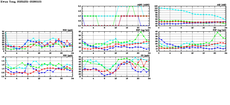 | Air Quality Data Time Series in Kwun Tong (2026/01/03) | ( Line colors: Day -3 Day -2 Day -1 Current day ) | 2D Map Current AQHI |