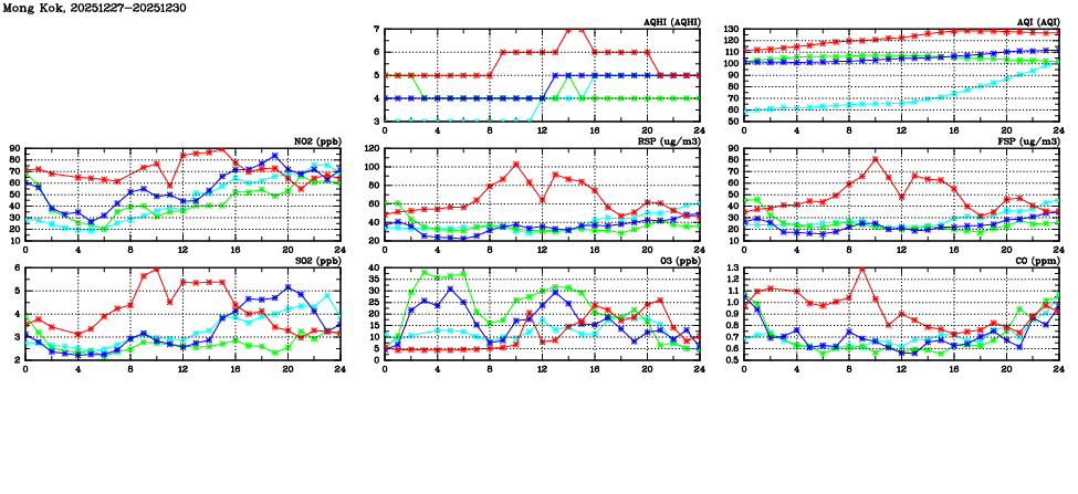 | Air Quality Data Time Series in Mong Kok (2025/12/30) | ( Line colors: Day -3 Day -2 Day -1 Current day ) | 2D Map Current AQHI |