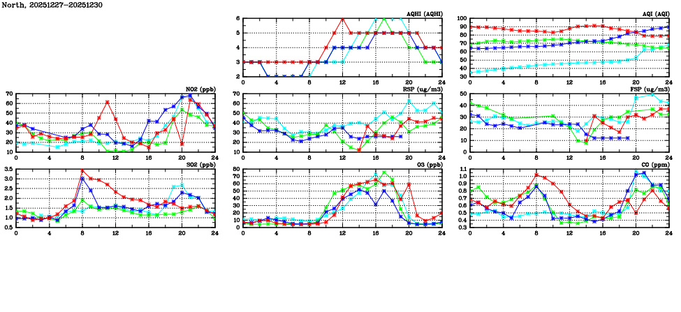 | Air Quality Data Time Series in North (2025/12/30) | ( Line colors: Day -3 Day -2 Day -1 Current day ) | 2D Map Current AQHI |