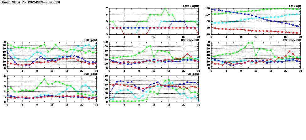 | Air Quality Data Time Series in Sham Shui Po (2026/01/01) | ( Line colors: Day -3 Day -2 Day -1 Current day ) | 2D Map Current AQHI |