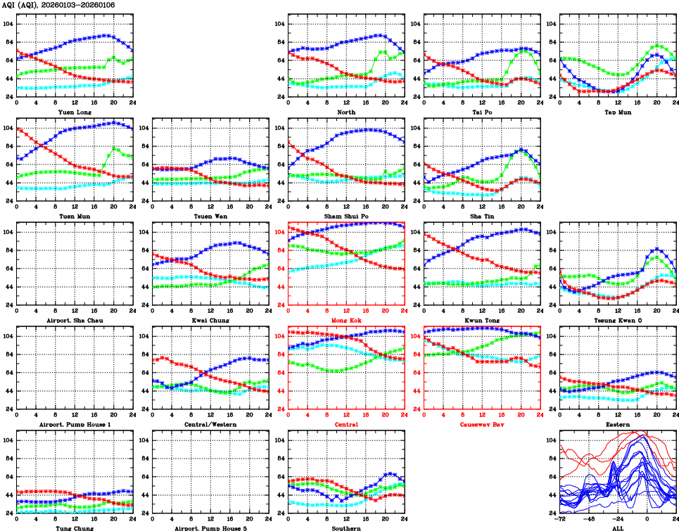 | Air Quality Data Time Series for AQI (2026/01/06) | ( Line colors: Day -3 Day -2 Day -1 Current day ) | 2D Map Current AQHI |