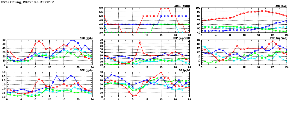 | Air Quality Data Time Series in Kwai Chung (2026/01/05) | ( Line colors: Day -3 Day -2 Day -1 Current day ) | 2D Map Current AQHI |