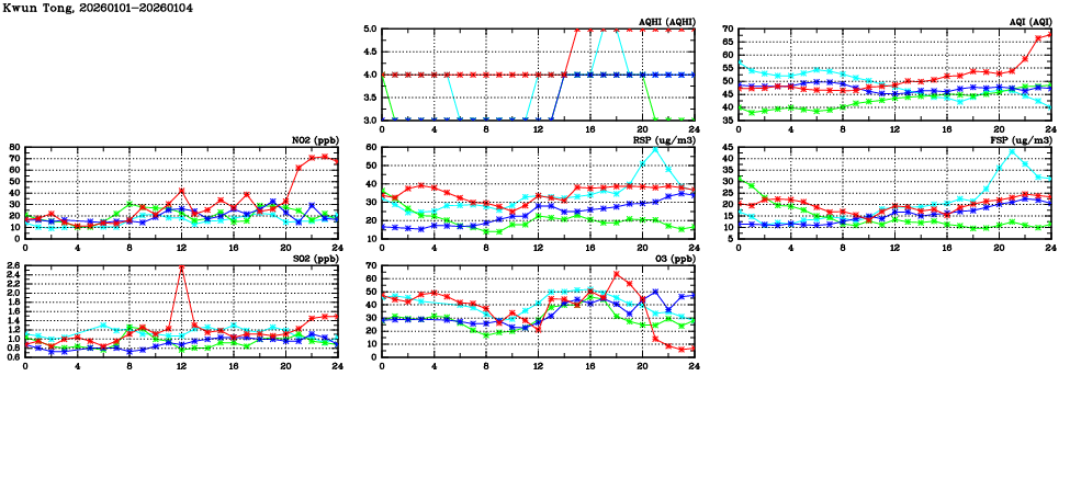 | Air Quality Data Time Series in Kwun Tong (2026/01/04) | ( Line colors: Day -3 Day -2 Day -1 Current day ) | 2D Map Current AQHI |