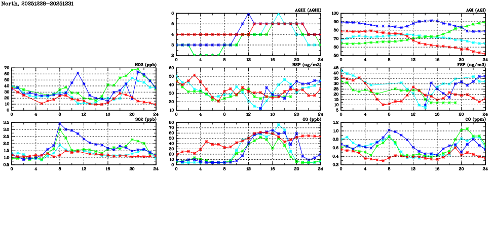 | Air Quality Data Time Series in North (2025/12/31) | ( Line colors: Day -3 Day -2 Day -1 Current day ) | 2D Map Current AQHI |