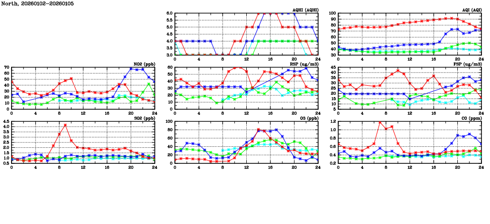 | Air Quality Data Time Series in North (2026/01/05) | ( Line colors: Day -3 Day -2 Day -1 Current day ) | 2D Map Current AQHI |