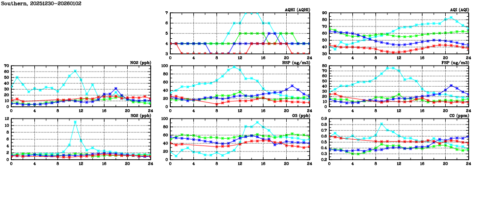 | Air Quality Data Time Series in Southern (2026/01/02) | ( Line colors: Day -3 Day -2 Day -1 Current day ) | 2D Map Current AQHI |