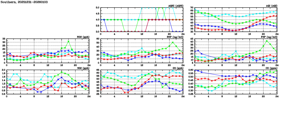 | Air Quality Data Time Series in Southern (2026/01/03) | ( Line colors: Day -3 Day -2 Day -1 Current day ) | 2D Map Current AQHI |