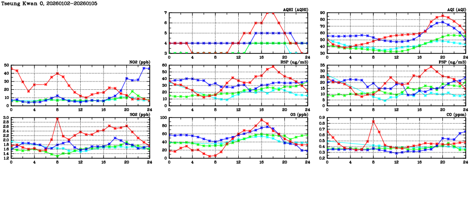 | Air Quality Data Time Series in Tseung Kwan O (2026/01/05) | ( Line colors: Day -3 Day -2 Day -1 Current day ) | 2D Map Current AQHI |