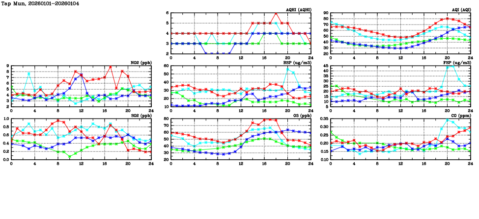 | Air Quality Data Time Series in Tap Mun (2026/01/04) | ( Line colors: Day -3 Day -2 Day -1 Current day ) | 2D Map Current AQHI |