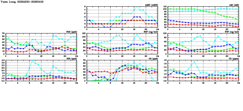 | Air Quality Data Time Series in Yuen Long (2026/01/02) | ( Line colors: Day -3 Day -2 Day -1 Current day ) | 2D Map Current AQHI |