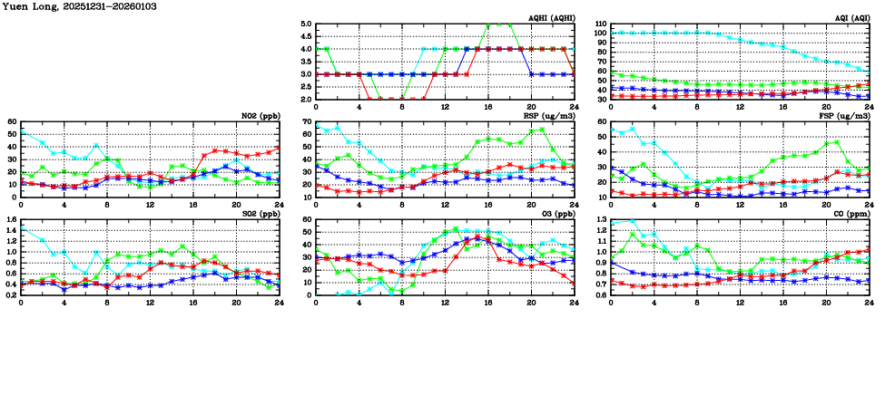 | Air Quality Data Time Series in Yuen Long (2026/01/03) | ( Line colors: Day -3 Day -2 Day -1 Current day ) | 2D Map Current AQHI |