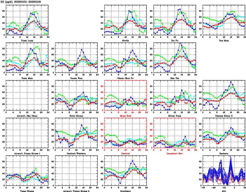 | Air Quality Data Time Series for O3 (2026/01/06) | ( Line colors: Day -3 Day -2 Day -1 Current day ) | 2D Map Current AQHI |