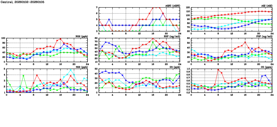 | Air Quality Data Time Series in Central (2026/01/05) | ( Line colors: Day -3 Day -2 Day -1 Current day ) | 2D Map Current AQHI |