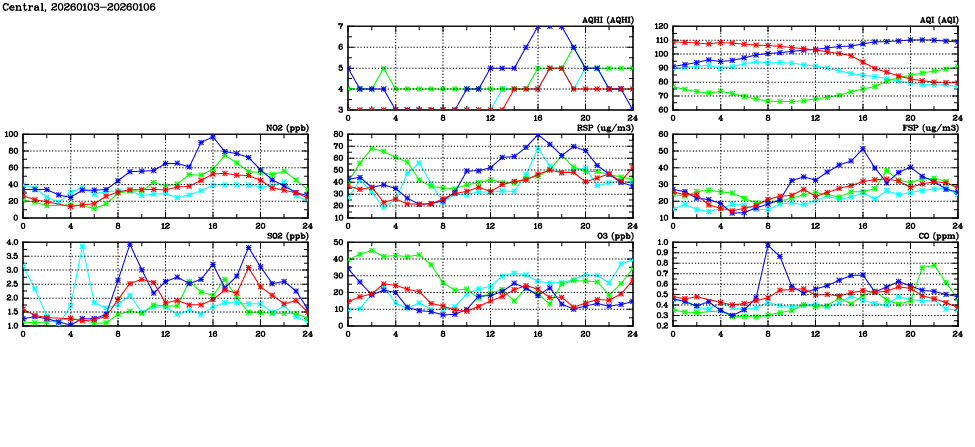 | Air Quality Data Time Series in Central (2026/01/06) | ( Line colors: Day -3 Day -2 Day -1 Current day ) | 2D Map Current AQHI |