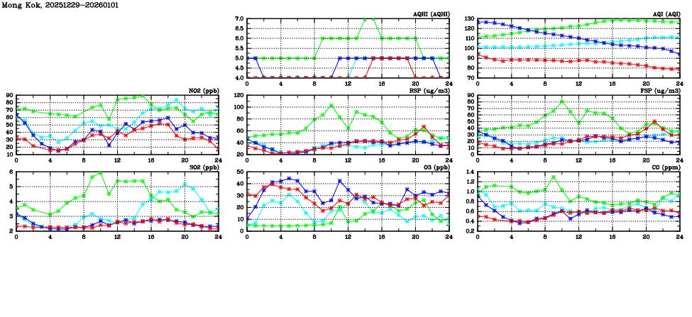 | Air Quality Data Time Series in Mong Kok (2026/01/01) | ( Line colors: Day -3 Day -2 Day -1 Current day ) | 2D Map Current AQHI |